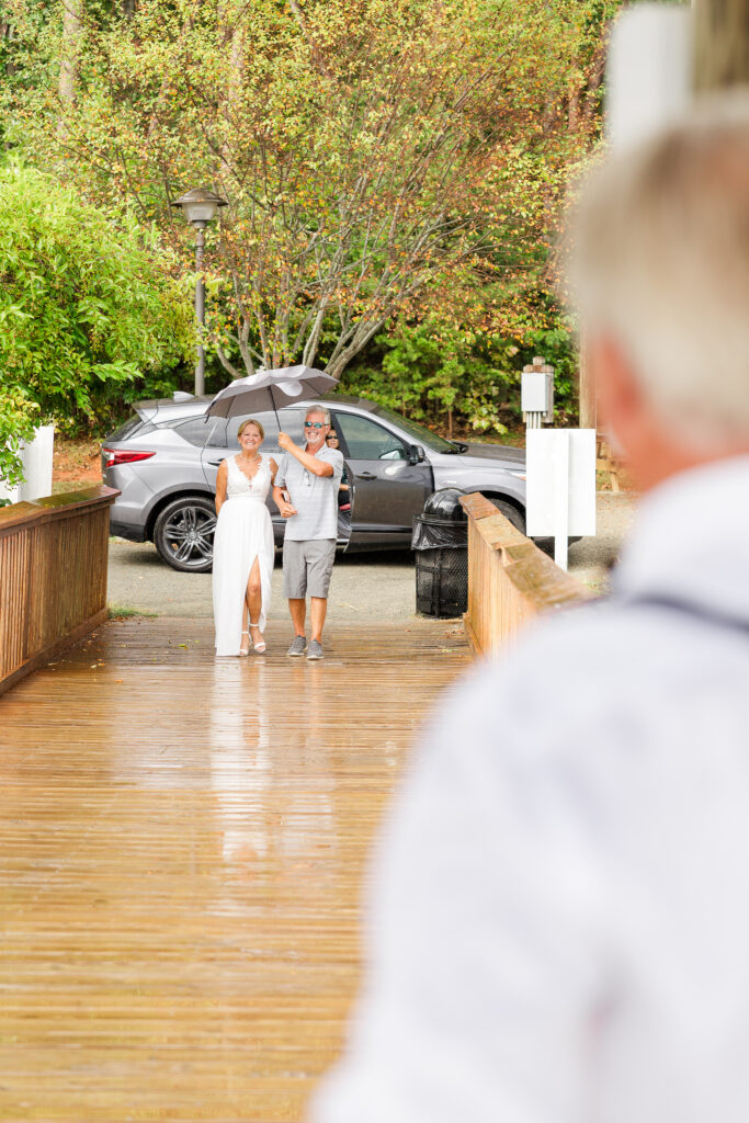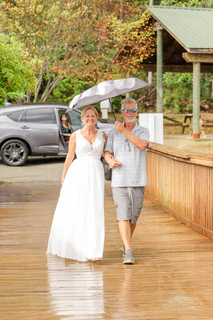 And then, just as quickly as it started, the rain softened and began to taper off. The clouds lingered, but the downpour faded enough to make a change of plans possible. Instead of staying under the pavilion, they decided to move forward with their ceremony out on the pier. That decision made all the difference.